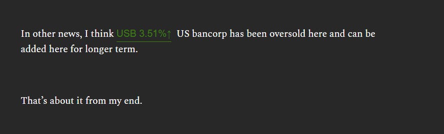 In the equity land, our individual equity pick from yesterday USB 0.00%↑ was up 8.91% today. Options were up nicely as well.