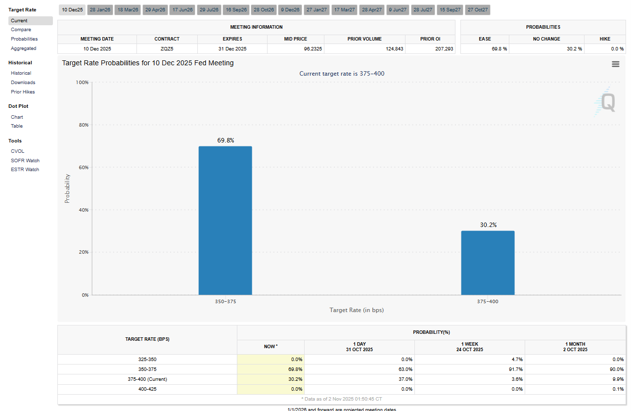 Markets reacted quickly. The implied probability of a December cut in CME FedWatch futures fell from more than 85% before the meeting to about 69%(NICE!) afterward. This repricing suggests the Fed’s communication strategy succeeded. The central bank is navigating a difficult path. The ongoing shutdown, estimated to trim 0.1 percentage points from GDP for each week it continues, has delayed key inflation and employment reports. Powell acknowledged the challenge and noted that policymakers would rely on alternative data sources, while recognizing the situation is not ideal.