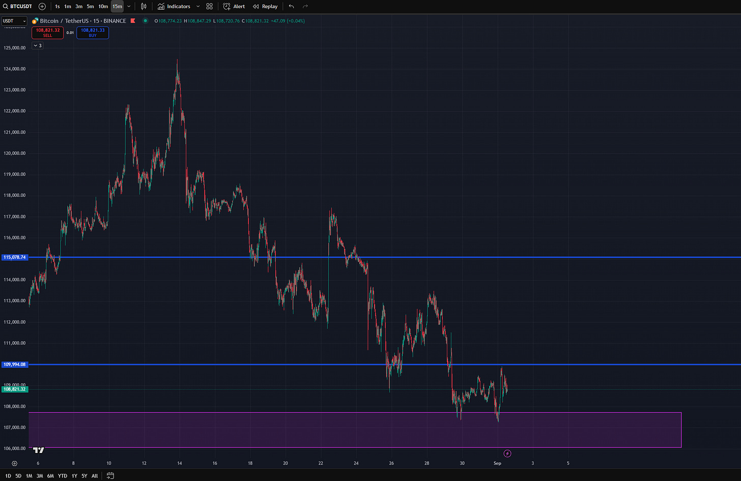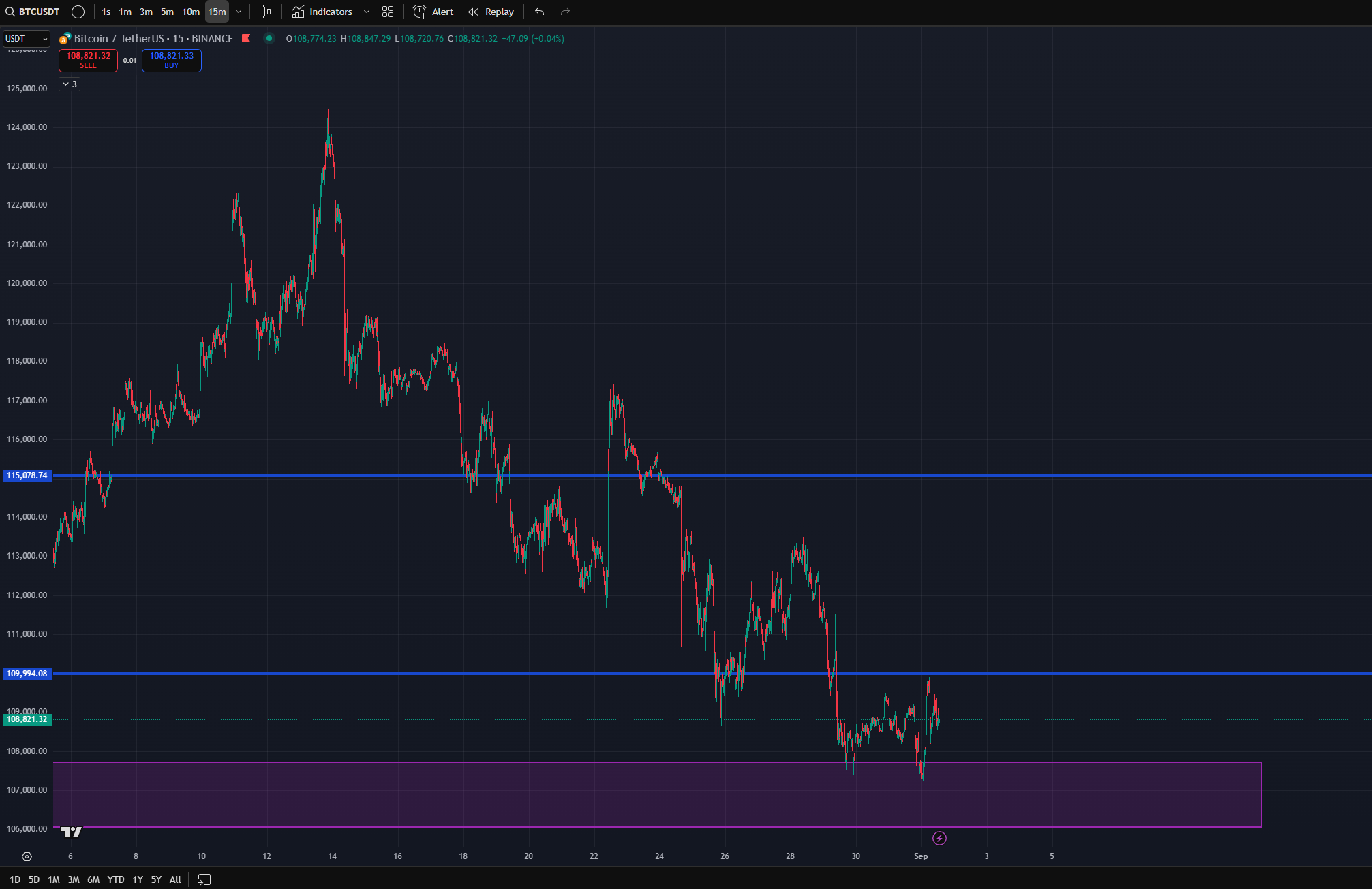 Entry: Await the daily close within the $106,000-$107,710 support zone.