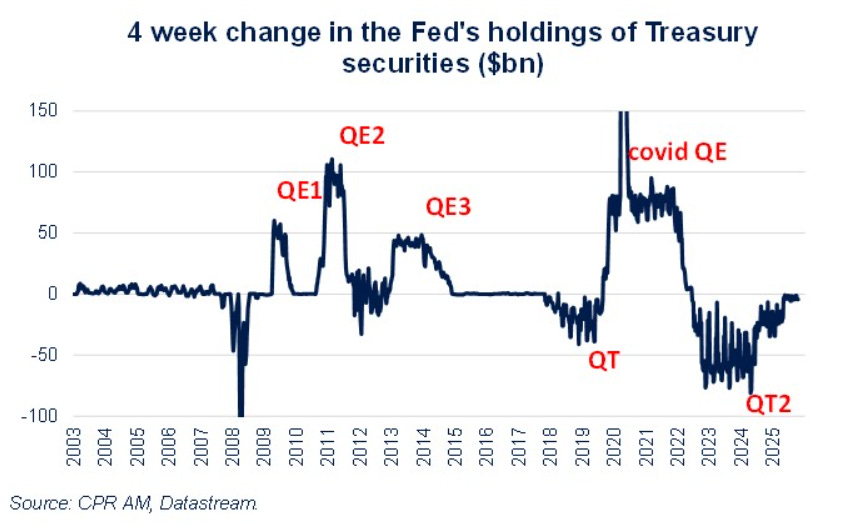 Arguably the most significant monetary development isn’t about interest rates at all, but about the Fed’s balance sheet policy. Chair Powell confirmed that, as of Dec 1, the Fed has stopped reducing its aggregate securities holdings. In effect, Quantitative Tightening is over.