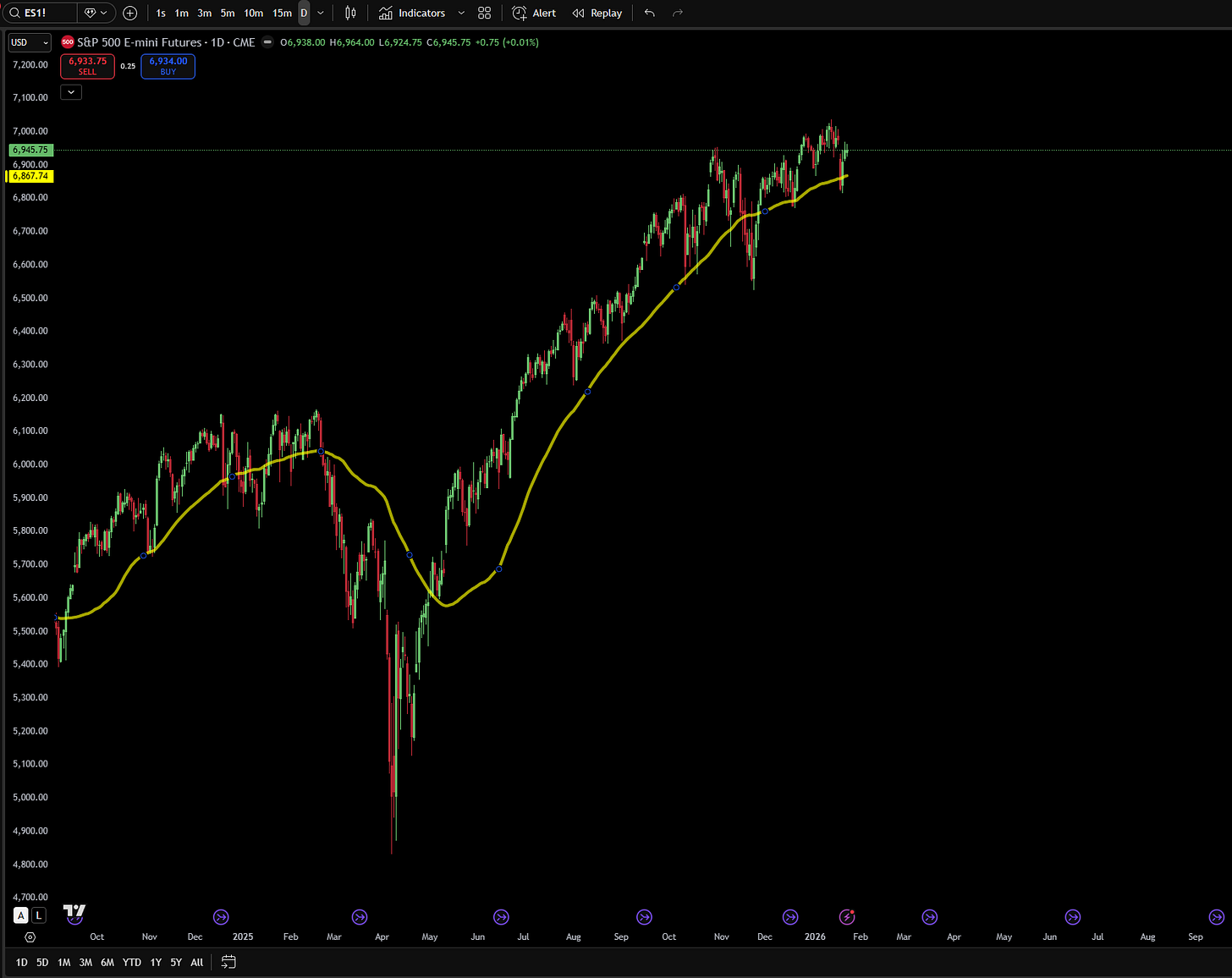 The key technical levels for ES futures are relatively well-defined(more levels at the end of the post). Overhead resistance awaits at 7,000, a level that represents both a psychological barrier and, more practically, an area where many traders have placed profit-taking orders. A decisive break above 7,000, defined as multiple daily closes accompanied by expanding volume, would likely trigger a wave of momentum buying that could carry prices to 7,200 or higher in short order.