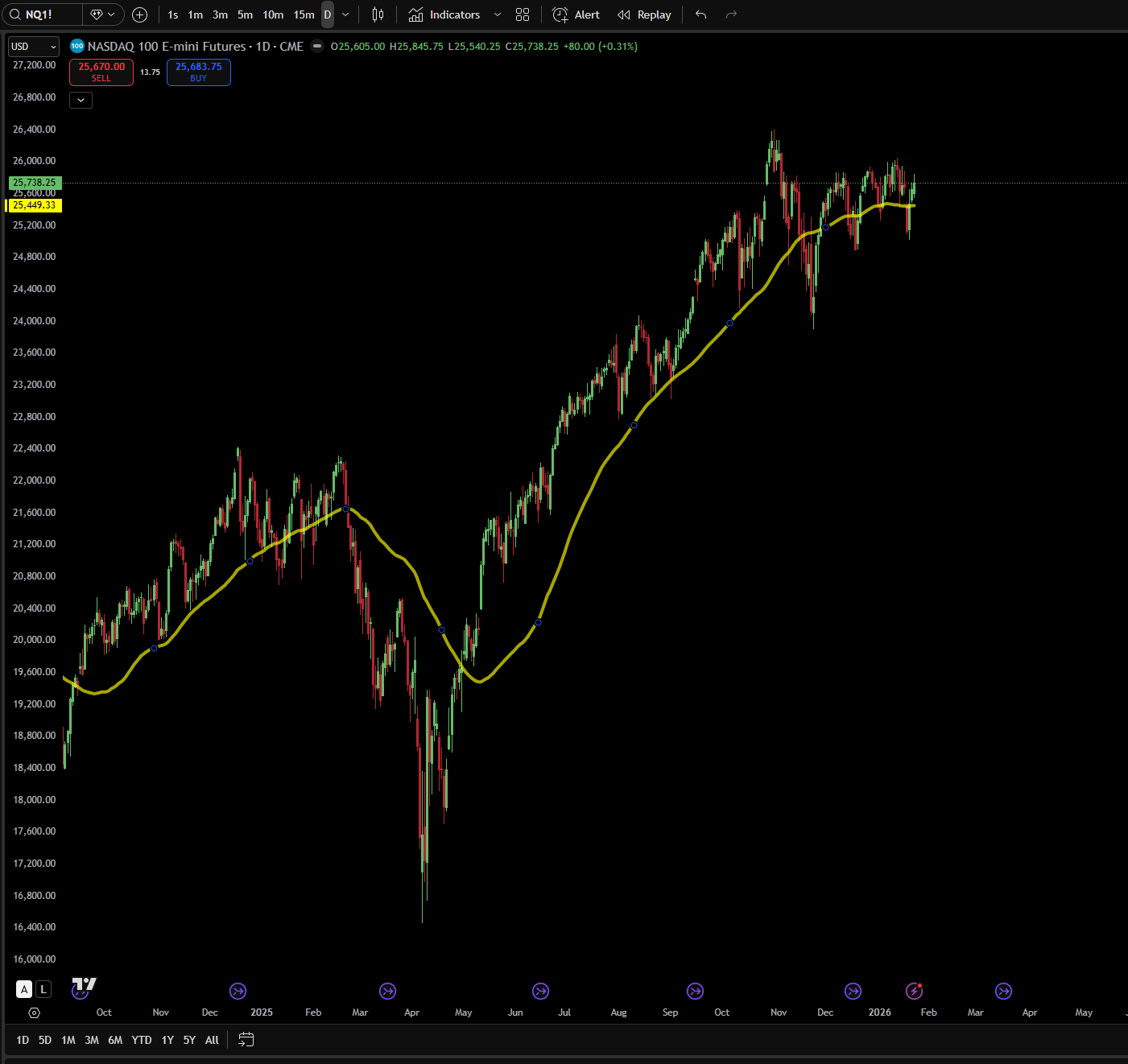 Key support levels for NQ futures lie at 25,250-to-25,300 in the near term, with more significant support at the 24,800-to-25,000 confluence zone(more levels at the end of the post). This deeper support level represents the intersection of daily and weekly demand areas and has significance for longer-term position traders. A sustained break below 24,800 would signal a more substantial correction, potentially targeting the 24,000 area, a decline of roughly 6% from current levels.