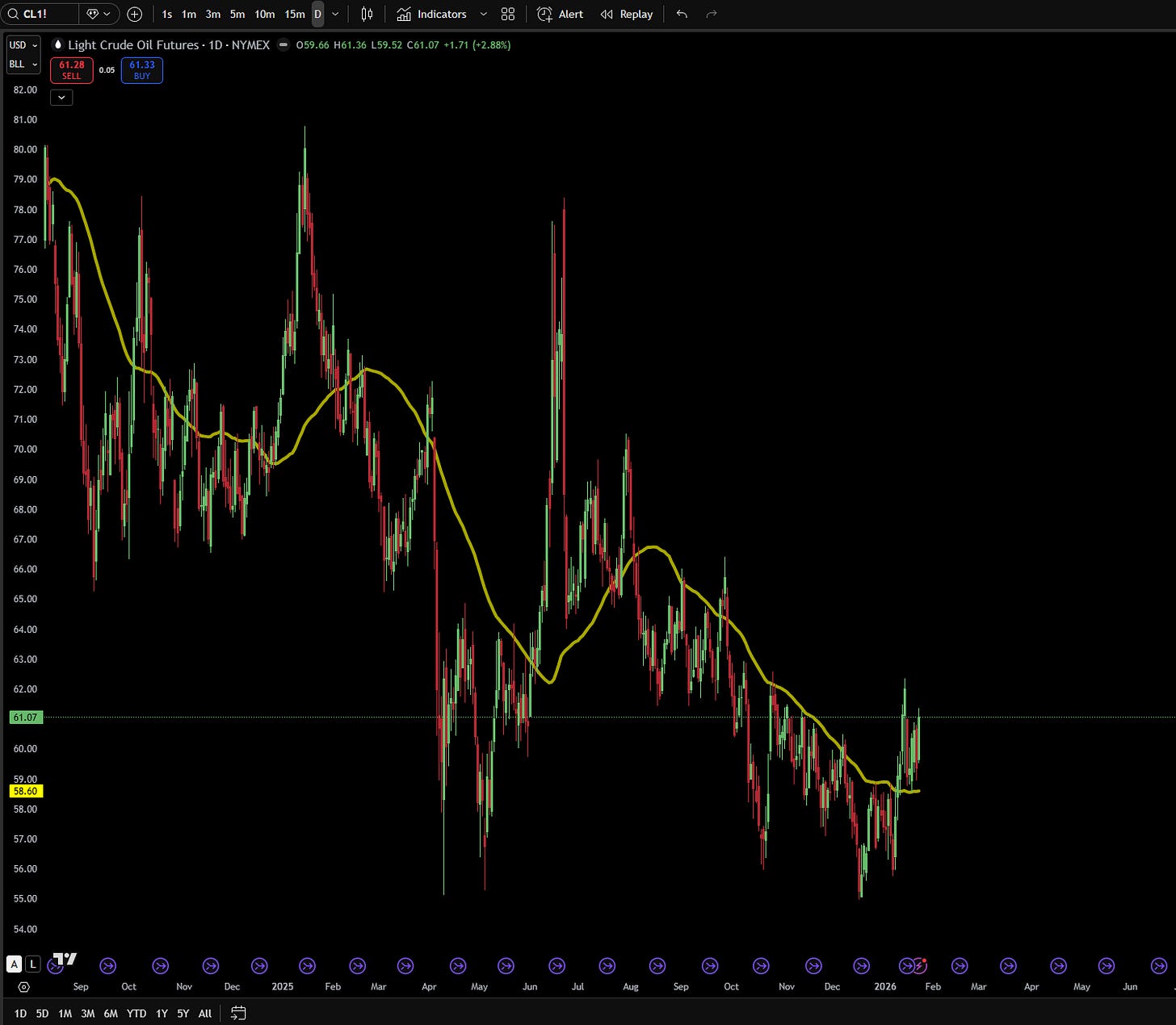 WTI crude opened 2026 near $57.40 per barrel, reflecting its worst annual performance in five years during 2025. The new year brought volatility, with prices touching a low of $55.76 on January 7 before rallying to $62.36 by January 14. As of January 25, WTI trades around $61 per barrel, supported by seasonal winter demand and geopolitical concerns but capped by an impending supply glut.