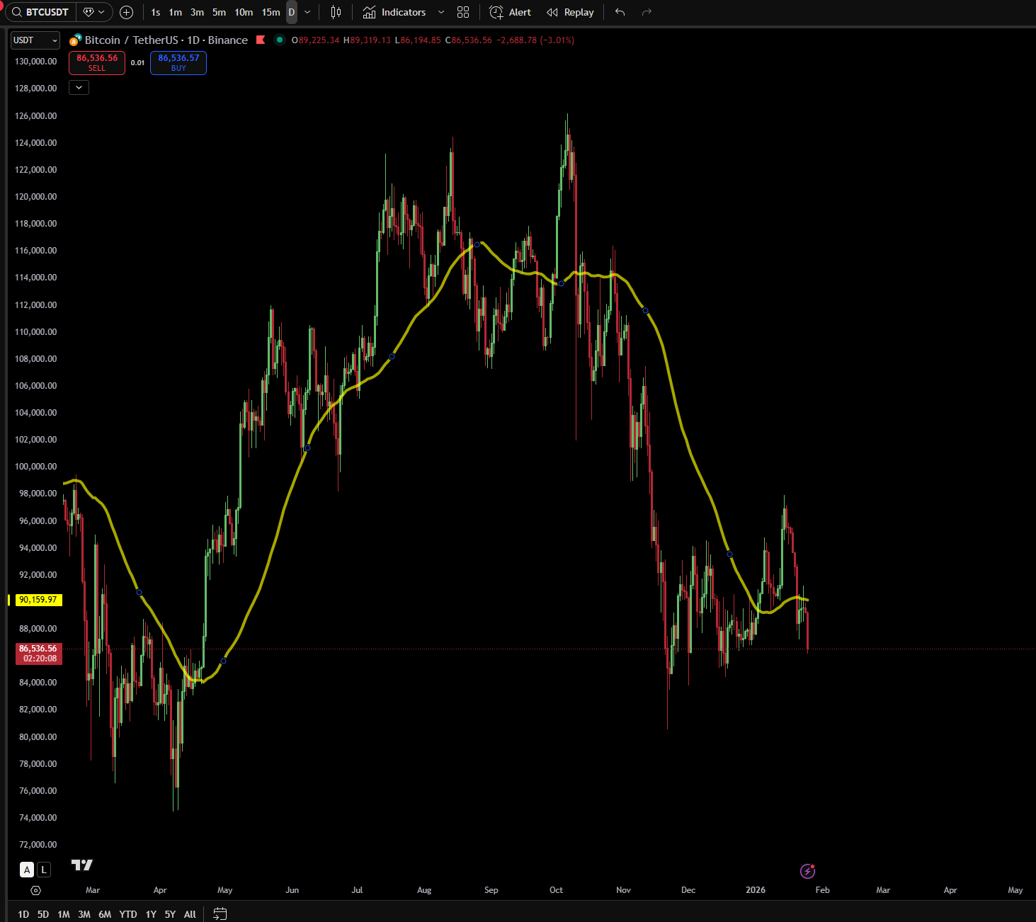 Bitcoin is under significant pressure right now. The weekly losses are concerning, and we’re seeing liquidation cascades that suggest overleveraged longs are getting flushed out. The key question is whether the $85,000-$87,000 zone holds as support. If that breaks, we could see a move toward $80,000 or lower.
