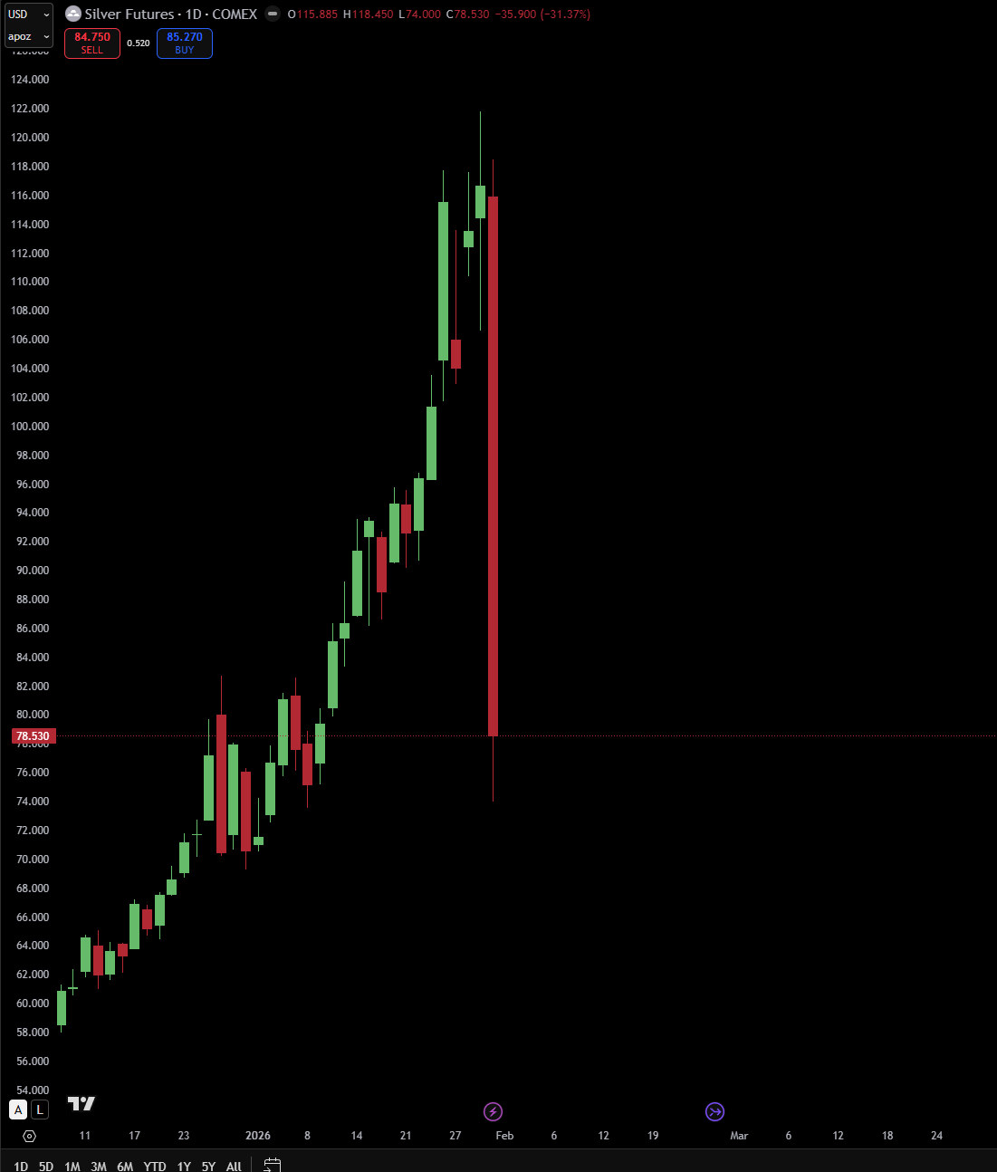 The result was a cascade crash. Silver plummeted from above $100 to as low as $75 in a matter of hours. Silver closed Friday, January 31 at $78.53, down 35% from the all-time high in just two days.