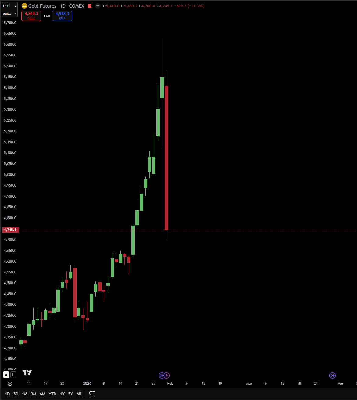 Gold Futures closed January 30 at $4,763.10, a stunning correction from the highs but still up roughly 10% for the month.