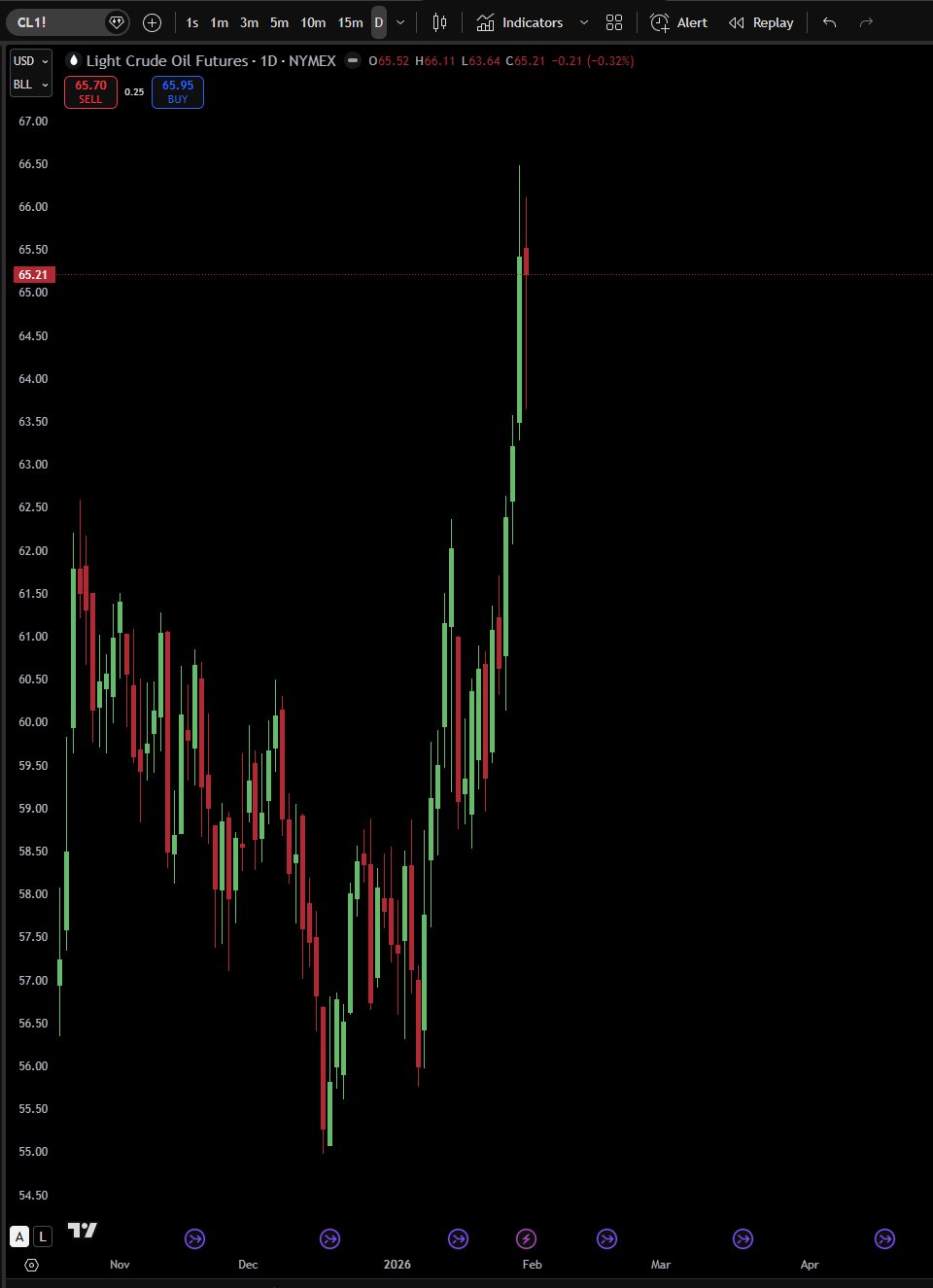 West Texas Intermediate futures surged 13.57% in January, their strongest monthly performance since July 2023, as tensions between Washington and Tehran ratcheted higher.