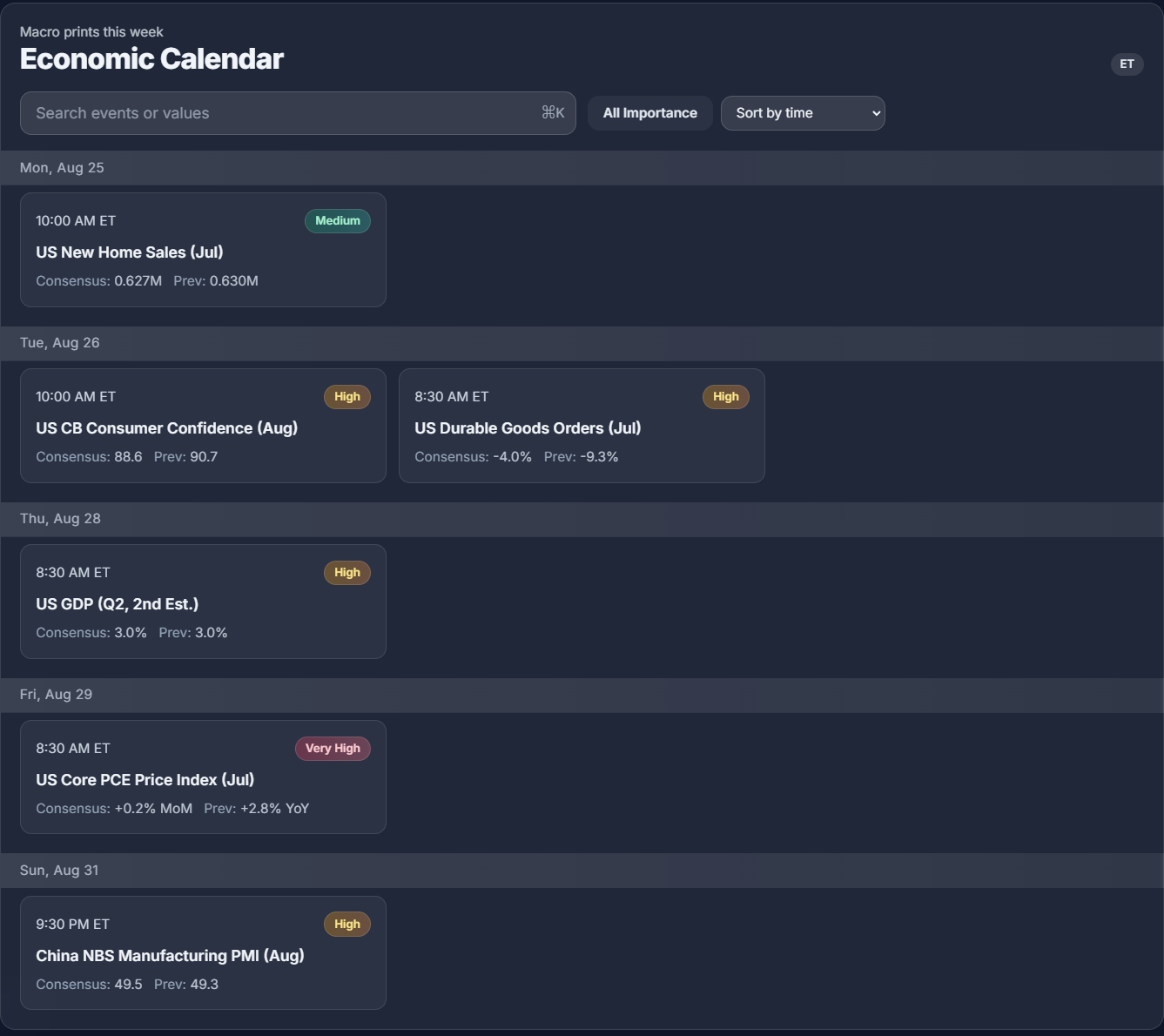 U.S.: July Core PCE (Fed’s preferred gauge) Friday. Hot print challenges September cut; soft print confirms dovish bets. GDP 2nd estimate Thursday. Durable Goods and Consumer Confidence Tuesday.