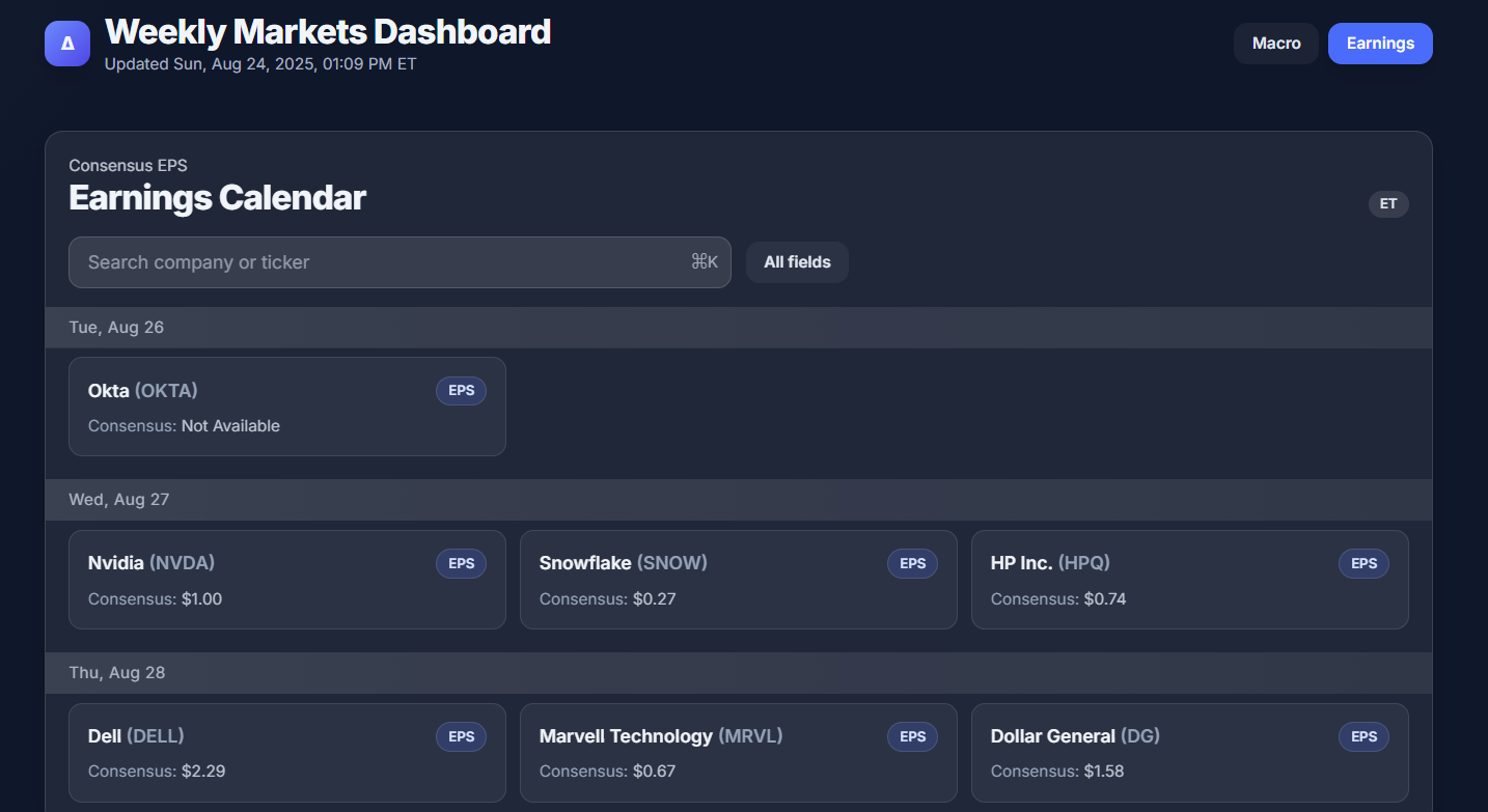 Earnings: Nvidia (Aug 27 after close) expected $1.00 EPS. Guidance on AI chips and U.S.–China trade is macro-critical. Also reporting: Dell, CrowdStrike, Snowflake, Autodesk, Marvell.