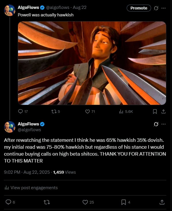 Powell's speech represents a calculated and significant policy gamble. The Federal Reserve is now explicitly signaling a willingness to tolerate a period of visibly higher, tariff-induced inflation, a known and quantifiable risk: in order to preemptively insure against a potential, but not yet realized, sharp downturn in the labor market. This marks a strategic shift away from the purely data-dependent, inflation-fighting posture of the past two years toward a more forward-looking, risk-management approach that prioritizes the employment side of its dual mandate. The Fed is fully aware of the inflationary impulse building in the economy; Powell's own words confirm that the effects of tariffs are "clearly visible" and will "accumulate over coming months," a fact corroborated by the recent 3.3% year-over-year jump in the Producer Price Index. Despite this clear and present inflation pressure, the entire thrust of his forward guidance was on the potential for a labor market shock. By choosing to emphasize a hypothetical future risk (rising unemployment) over an actual current risk (rising inflation), the Fed is making a deliberate policy choice. It is accepting higher inflation in the near term as the cost of preventing a recession. This recalibrates the market's understanding of the central bank's reaction function. The bar for a hawkish response to hot inflation data is now considerably higher, while the bar for a dovish response to any signs of weakness in employment data is now much lower. This logic fully justifies the market's explosive "risk-on" reaction and validates the return of the "Powell put," though its strike price now appears to be tied more directly to the unemployment rate than to stock market volatility.